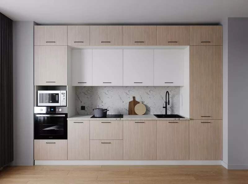 Модули первого верхнего яруса с фасадами со свесом 12 мм, что позволяет открывать их без установленных ручек.