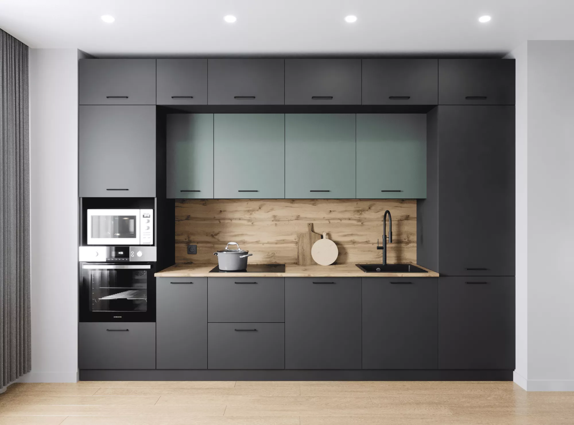 Модули первого верхнего яруса с фасадами со свесом 12 мм, что позволяет открывать их без установленных ручек.