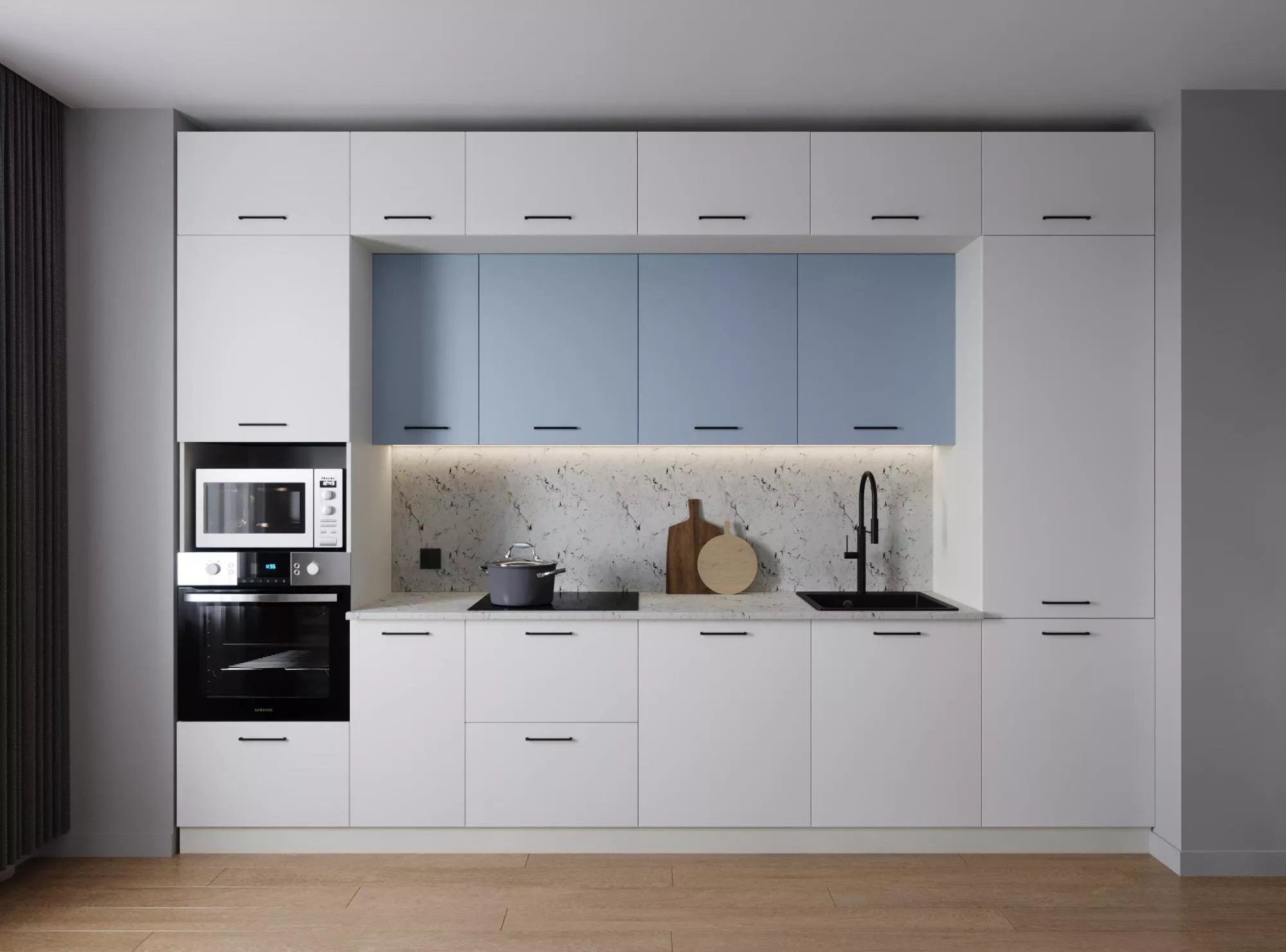 Модули первого верхнего яруса с фасадами со свесом 12 мм, что позволяет открывать их без установленных ручек.