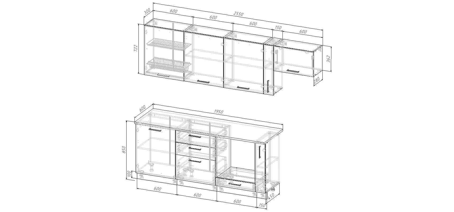 Фасады верхних модулей со свесом 12 мм дают возможность использовать без установки ручек.