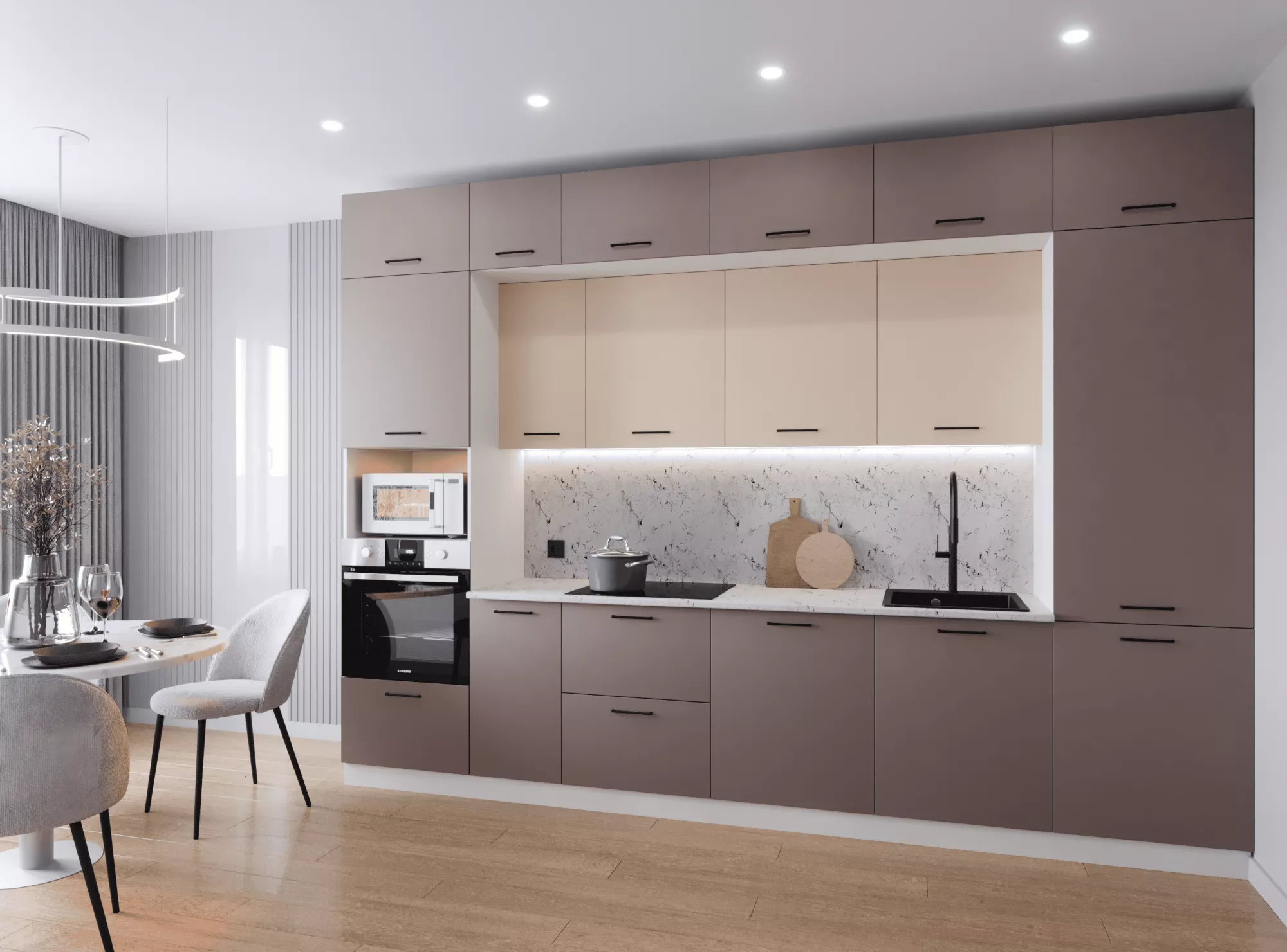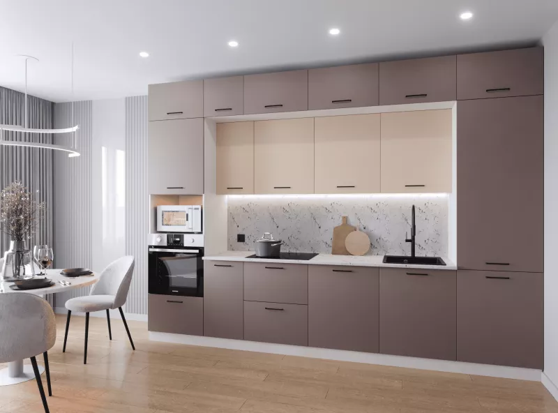 Модули первого верхнего яруса с фасадами со свесом 12 мм, что позволяет открывать их без установленных ручек.