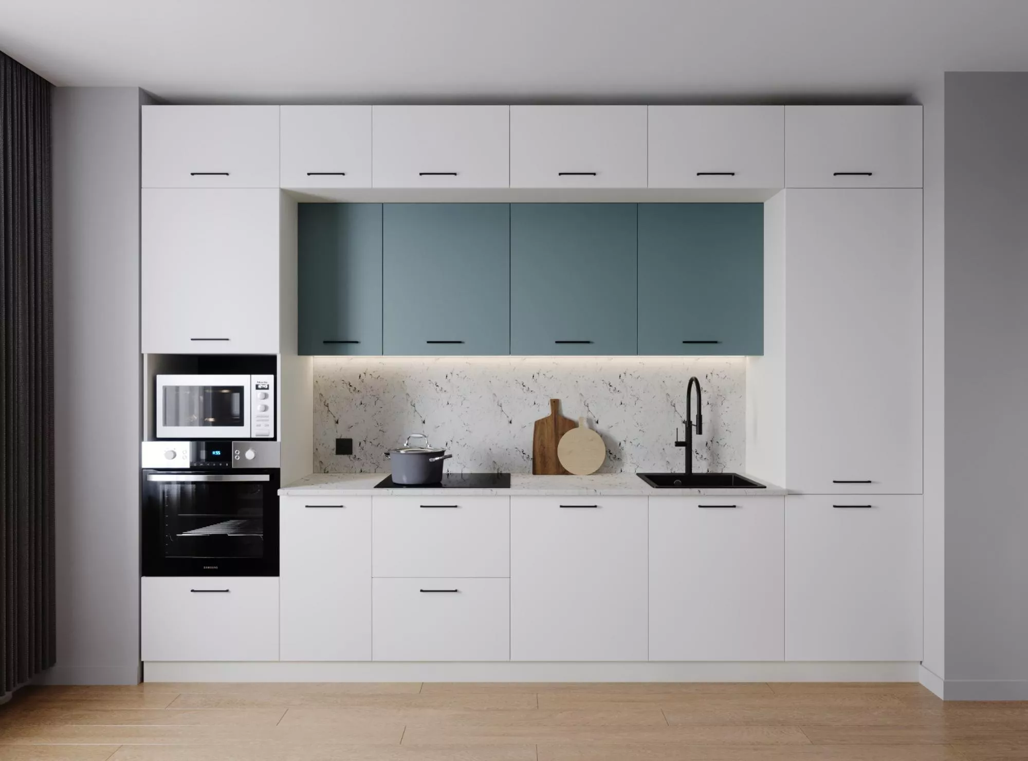 Модули первого верхнего яруса с фасадами со свесом 12 мм, что позволяет открывать их без установленных ручек.