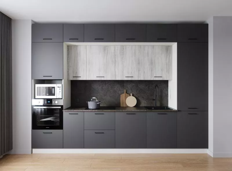 Модули первого верхнего яруса с фасадами со свесом 12 мм, что позволяет открывать их без установленных ручек.