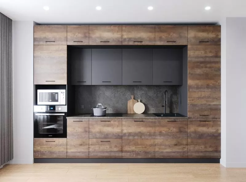 Модули первого верхнего яруса с фасадами со свесом 12 мм, что позволяет открывать их без установленных ручек.