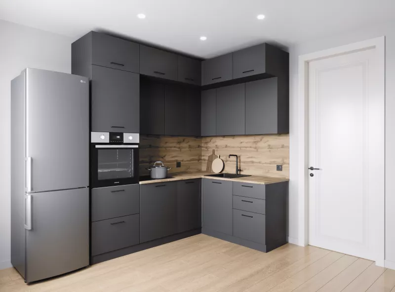 Столешницы цельные, с пластиковым покрытием со скруглением по переднему краю (постформинг толщиной 26/38 мм).