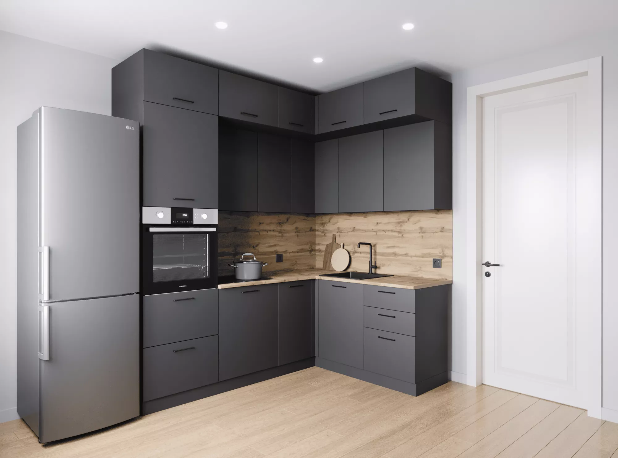 Модули первого верхнего яруса с фасадами со свесом 12 мм, что позволяет открывать их без установленных ручек.
