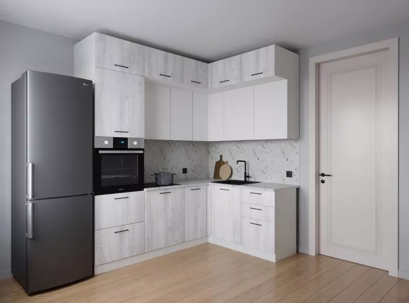 Модули первого верхнего яруса с фасадами со свесом 12 мм, что позволяет открывать их без установленных ручек.