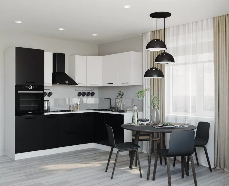 Столешницы цельные со скруглением по переднему краю, пластиковым покрытием и силиконовый каплесборник (защищает фасады нижних модулей от попадания влаги и разбухания);