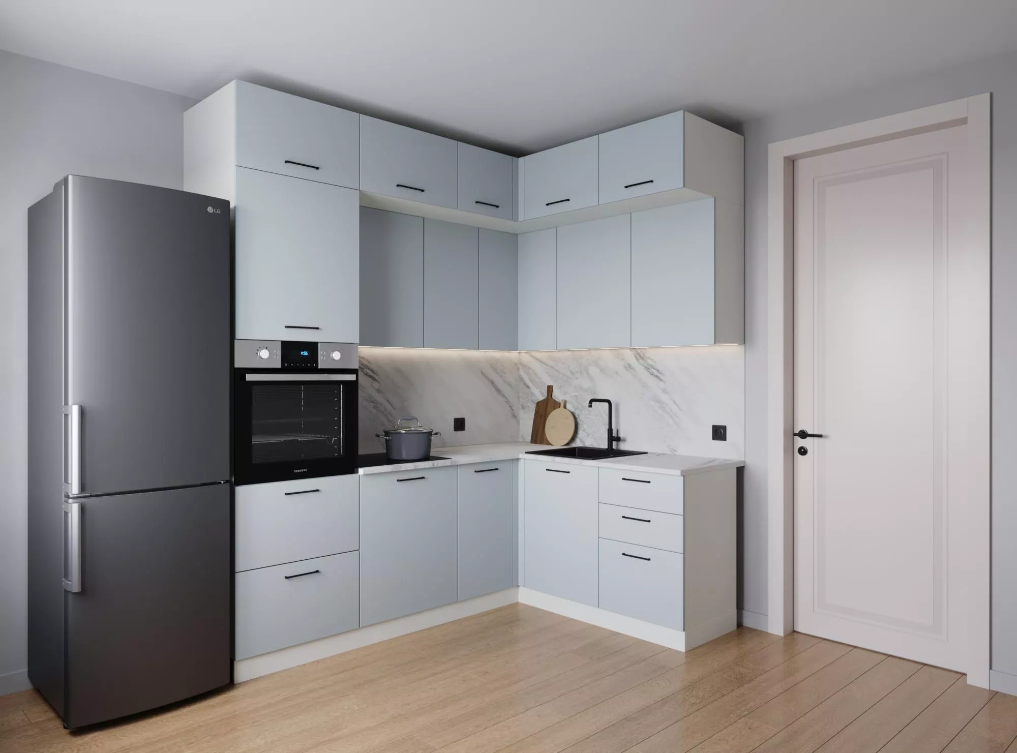 Модули первого верхнего яруса с фасадами со свесом 12 мм, что позволяет открывать их без установленных ручек.