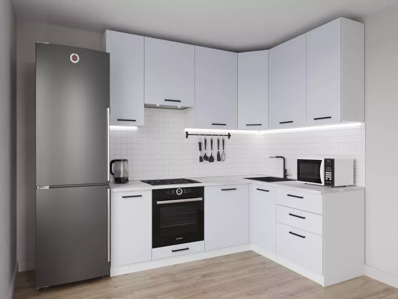Фасады верхних модулей со свесом 12 мм дают возможность использовать без установки ручек.