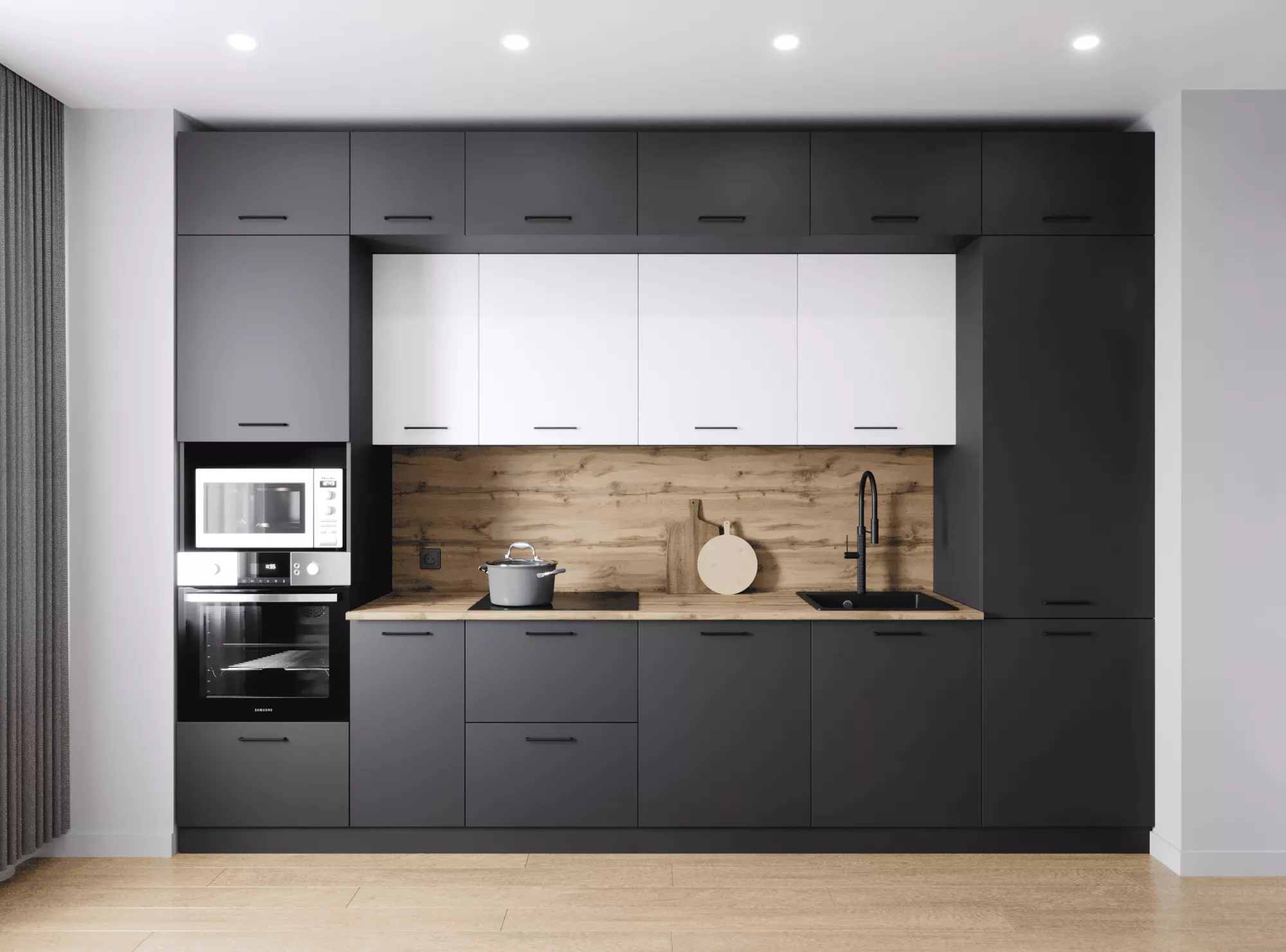 Модули первого верхнего яруса с фасадами со свесом 12 мм, что позволяет открывать их без установленных ручек.