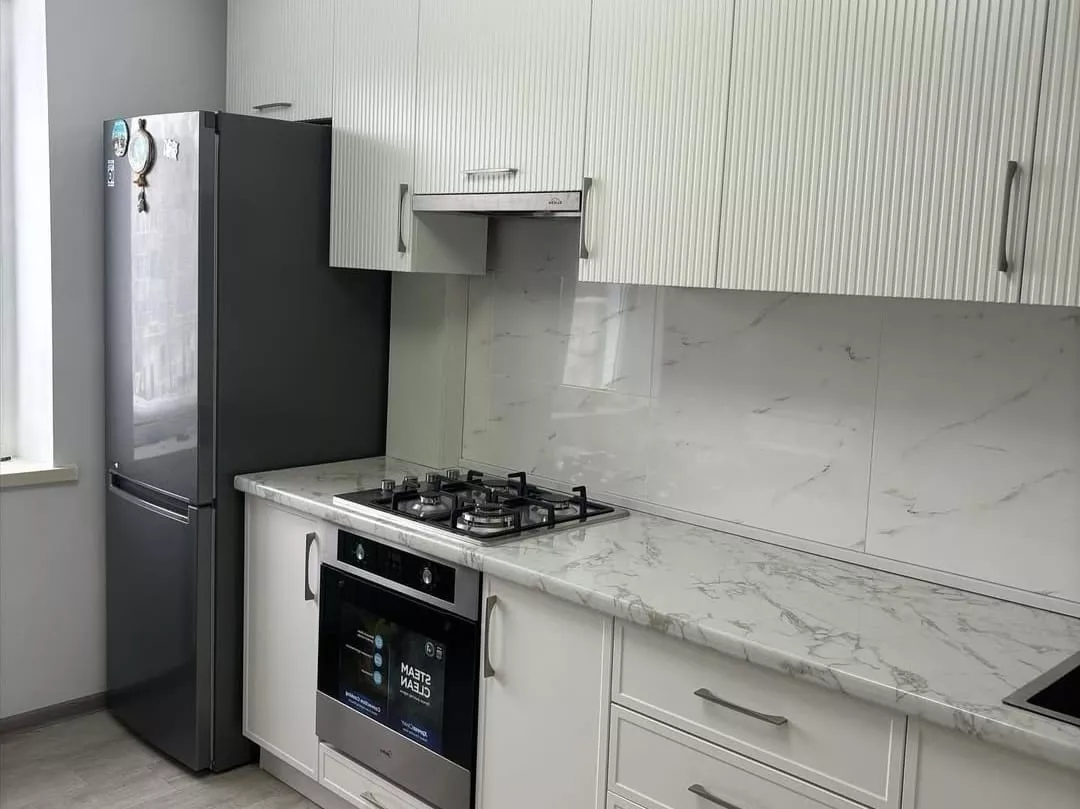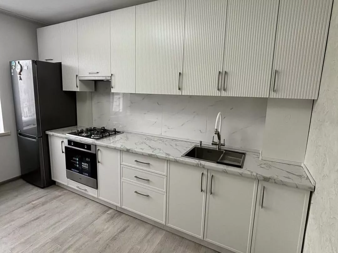 Кухонный гарнитур Прямой из МДФ в цвете меренга с изысканной фрезеровкой Бернедо и Каролина — это идеальное решение для создания стильного и функционального пространства в вашей кухне.