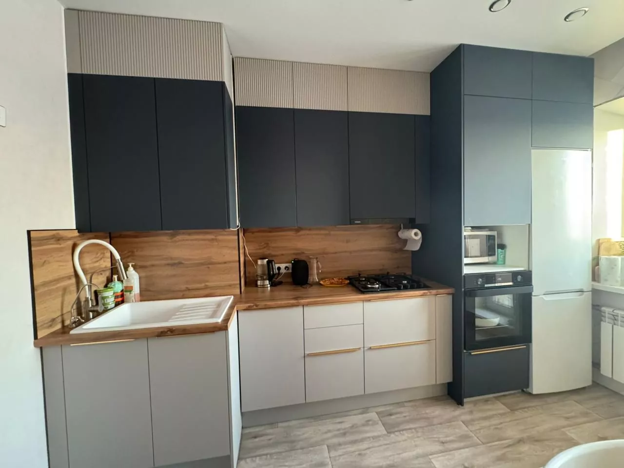 Контрастный оттенок фасадов из ЛДСП "Антрацит" придаёт нотки современности и стиля, а столешница из дуба вотан добавляет натуральности и тепла.