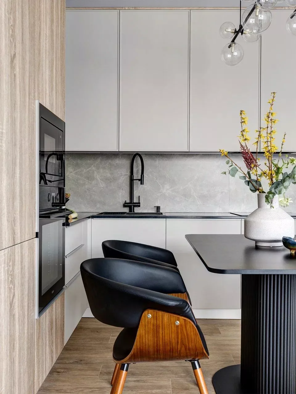 Угловой кухонный гарнитур с восхитительными фасадами из МДФ цвета меренга воплощает в себе элегантность и функциональность.