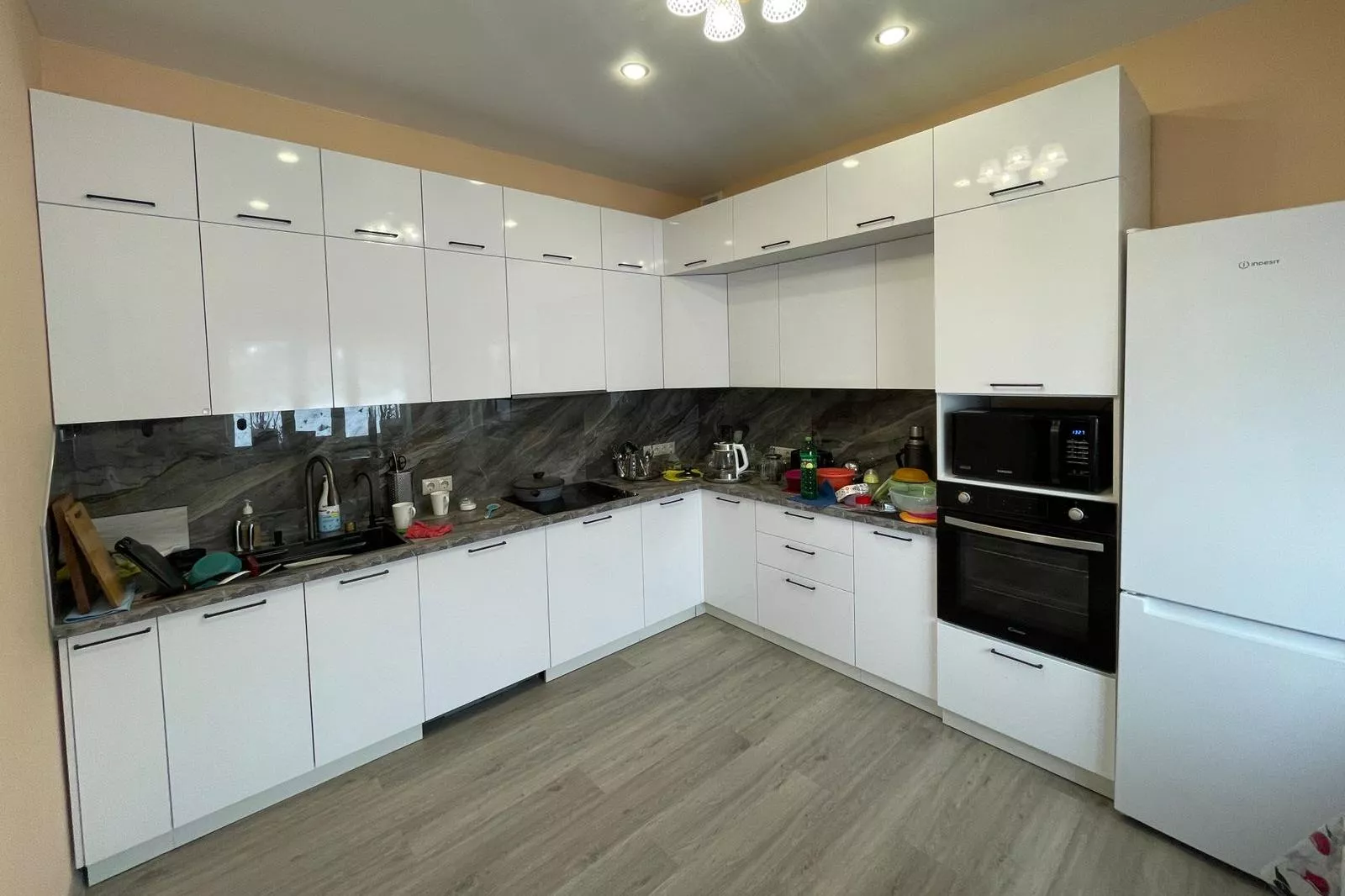 • Кухонный гарнитур Угловой двухуровневый, ЛДСП, жемчуг